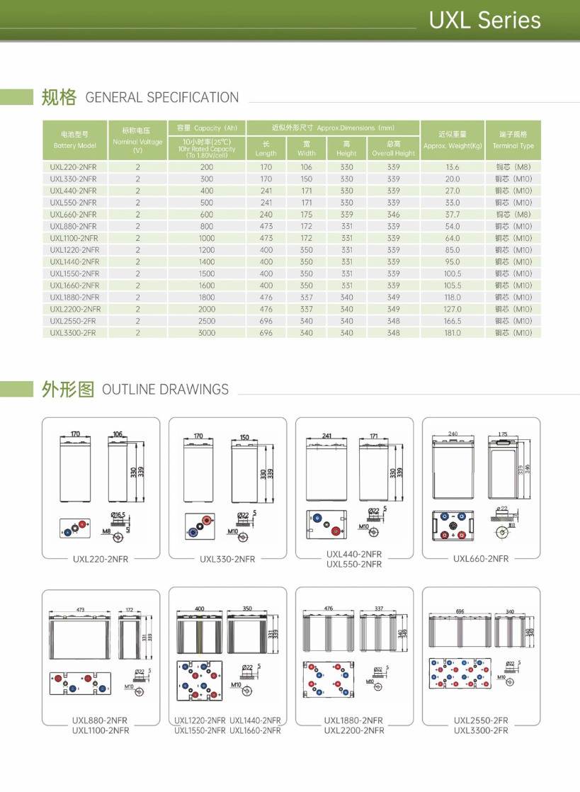 YUASA蓄电池 UXL 系列是面向高压配电、大型 UPS、数据中心等场景的 2V 阀控式密封铅酸(VRLA)蓄电池,核心优势是长寿命、免维护、高安全、大电流适配,胶体 + 阀控设计,25℃浮充寿命可达 15 年,深度循环约 2000 次。胶体 + 阀控密封设计:电解液添加胶体并被隔板吸附,无游离酸,可 90° 倾斜安全使用;阴极吸收循环,免加水维护,过压可通过安全阀排气;板栅采用耐蚀铅钙合金,大电流放电能力强:内阻低,适配电力系统、数据中心的短时大电流应急需求;深放电后恢复性能好。环境适应性好:自放电率低,可在较宽温度范围稳定运行(建议 20–25℃浮充);通过 CE、RoHS 等认证