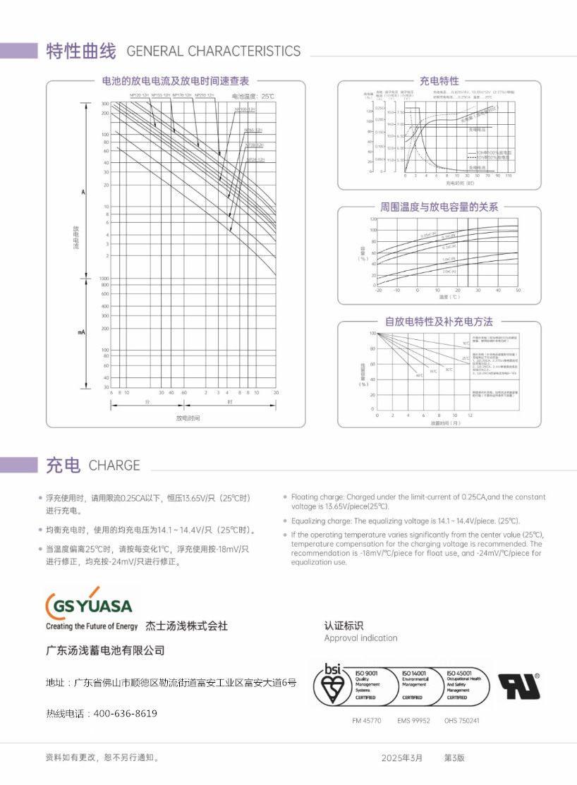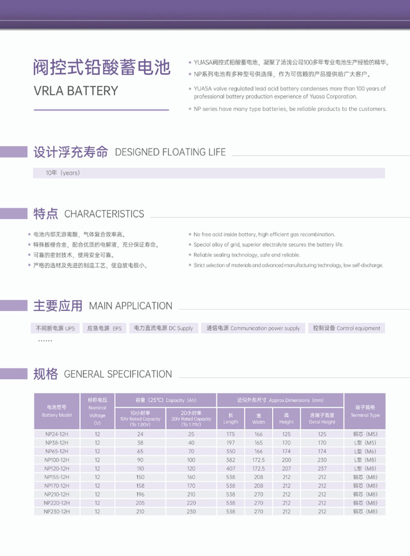 汤浅电池NP系列是阀控式密封铅酸蓄电池,核心优势在于免维护、长寿命、高安全与强适应性,适配 UPS、通信、安防、应急照明等多场景。阀控密封与免维护:采用氧复合技术,充电时产生的气体大部分被极板吸收还原为电解液,几乎无电解液损耗,无需补水或调节比重,显著降低运维成本。高持液与防漏设计:电解液被特殊 AGM 隔板吸附,呈不流动状态,电池可 90° 倒置使用,适配立式 / 卧式等多种安装方式,降低安装空间限制。安全阀与多重安全防护:内置安全阀在过充或异常时自动排气,防止电池破裂;阻燃单向排气阀减少可燃气体聚集,外壳为高强度 ABS 材质,抗冲击、耐高温,符合 UL/CE 等国际安全标准。